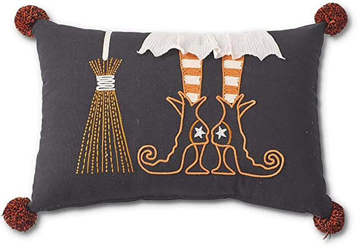 Black Rectangular Stitched Witch Boot and Broom Pillow