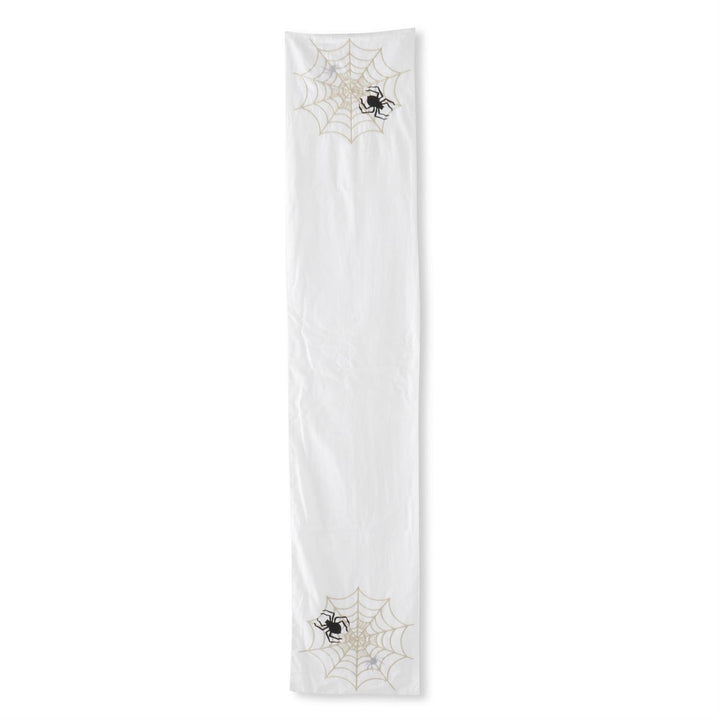 72 Inch White Halloween Table Runner with Embroidered Spiders & Web