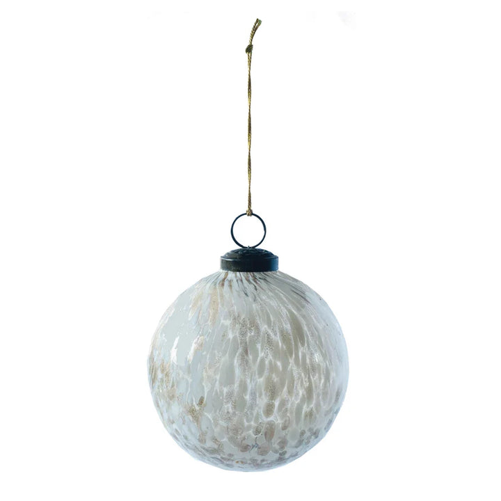 This confetti glass ball ornament is a beautiful and festive addition to the home. The ornament features a glass ball that is filled with white and gold confetti, creating a textured and shimmering effect. The ornament also has a metal cap to attach a string or a hook for hanging. The ornament is made of clear glass and metal, with a smooth and glossy surface. It is easy to clean and store. The ornament measures 3 inches in diameter. This confetti glass ball ornament is a wonderful gift for anyone, especially for celebrating the festive season. A sparkling and festive glass ball ornament with white and gold confetti and a metal cap. A perfect piece for adding some glamour and joy to the Christmas tree or home decor. Ideal for hanging on a tree branch, a window, a wall, or a mantel, or as a gift for someone who loves glitter.