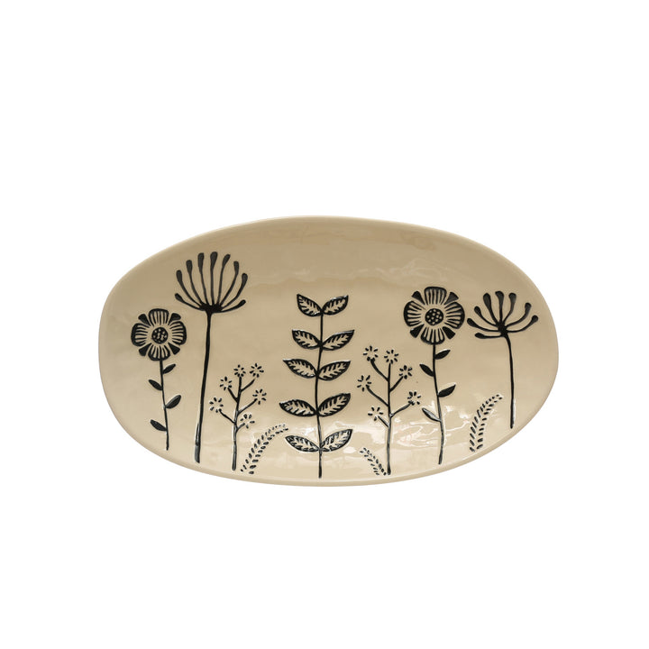 Hand-Painted Stoneware Platter with Embossed Flowers